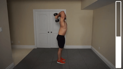站姿,上身挺直,核心收紧,两手各持一哑铃置于身体两侧屈臂将哑铃举起,小臂与大臂尽量靠拢,稍停然后慢慢放下哑铃至两臂完全伸直动作过程中不要借助腰部力量完成动作,哑铃放下不要向后摆动