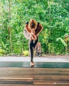 站立,双手扶髋,微屈膝抬右腿向上,与左腿相互缠绕双手侧平举,左手下右上缠绕呼气臀部向后向下坐,髋中正双肩放松,保持5-8个呼吸