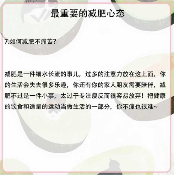 10、少食多餐,你可以由一天的三餐变成一天的五餐,当然少食多餐的前提是少食!不是直接让你加两餐的意思,告诉身体一个信号,你不需要把我吃到的食物囤积成脂肪储存下来,因为你随时需要能量的时候,我都会吃,这时候身体就不会去囤积脂肪,只要饿了就吃一点,一把坚果、一个苹果或者是一小杯代餐都ok。