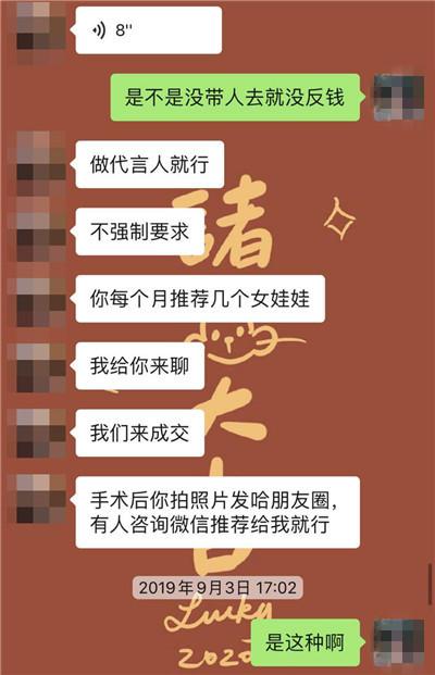 “美容机构给我们所有人的表达都是代言人免费做整形,每个月有代言费。我们需要做的就是至少一个月推一个好友给他们。就我所知道的就有10来个,大家都被套路,分别在三家机构做了整形。”佳佳告诉都市新闻记者。
