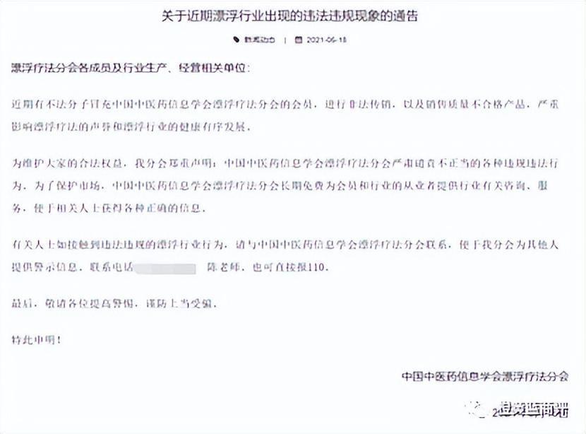 此外,2021年6月18日,漂浮疗法分会专门发布了《关于近期漂浮行业出现的违法违规现象的通告》。