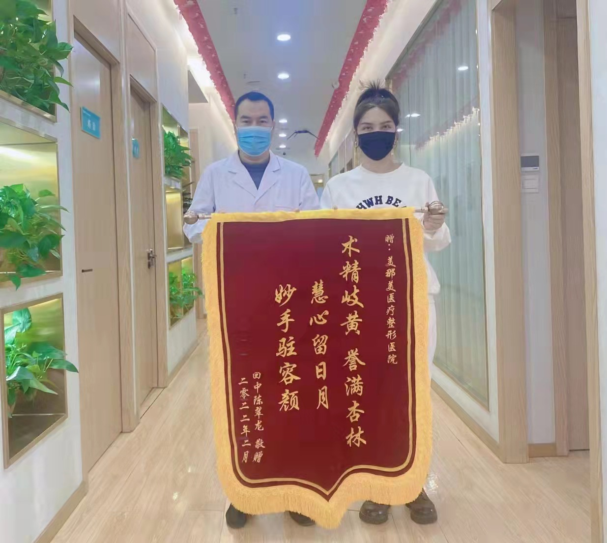 李大姐是一位成功商业人士,对自身容颜要求极高,但毕竟是50岁的人了,面部皮肤松弛下垂,苹果肌萎缩,太阳穴凹陷,泪沟,法令纹都很,整个人看上去显得憔悴,有点儿苦相、寡像,严重影响心情。为此,她很是苦恼,多处打听,后来找到洛阳市西工区解放路50号美那美医疗美容梁建静。梁建静为其详细检查,精心制定手术方案,先做部脂肪填充。李大姐顺利接受手术,术后果好,脸饱满了,面色也变好了,她的朋友都说他回到了三十多岁。李大姐高兴,术后不到2个月,又找到梁建静,要求把上睑下睑过多的皮肤都去除,梁建静为她精心设计,细心操作,为她做了上睑皮肤松弛矫正术,下睑皮肤松弛矫正术,术后双眼弧度流畅,宽窄对称,睁眼有神,闭眼,果好,眼睛明亮,人也精神了许多。她兴奋,精心制作了一面旌旗,上书“术精歧黄,誉满杏林,慧心留日月,妙手驻容颜,”亲自送到医院,以表感激之情。