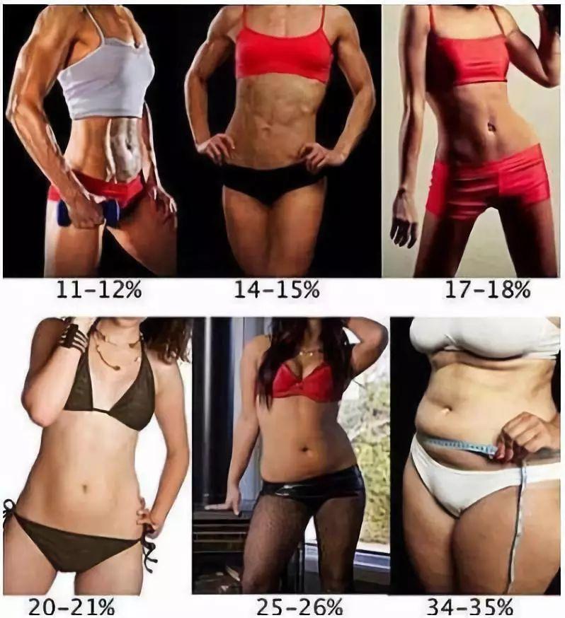 对照上图,可以看到体脂率越低,脂肪含量越少,体形越健美。体脂率达到18%时,马甲线和身体线条就会自动出现啦!即使靓丽如维密天使,她们的魔鬼曲线也不是天生就有,而是通过大量训练得来的。