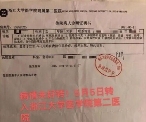 5月5日,经家人商量,小冉被转入浙江大学医学院附属第二医院进行调节,在转院的过程中家人第一次见到术后的小冉,多器官衰竭,前胸到肚子皮肤大面积溃烂,浮肿。