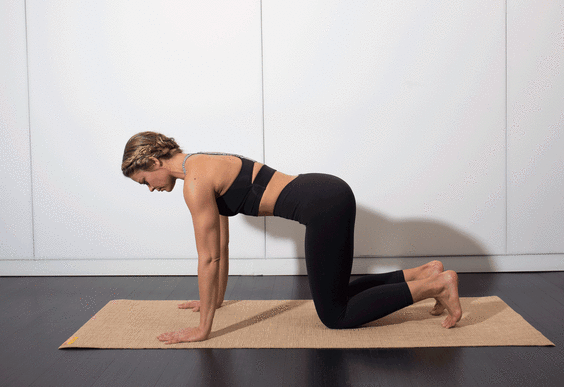 跪立在垫面上,双脚双手打开与髋同宽前脚掌推地,大腿手臂垂直垫面呼气,骨盆微微向后转动肚脐贴向脊柱的方向,膝盖离地静态保持20-30秒,或者保持5秒钟动态重复练习8-10组动作2: